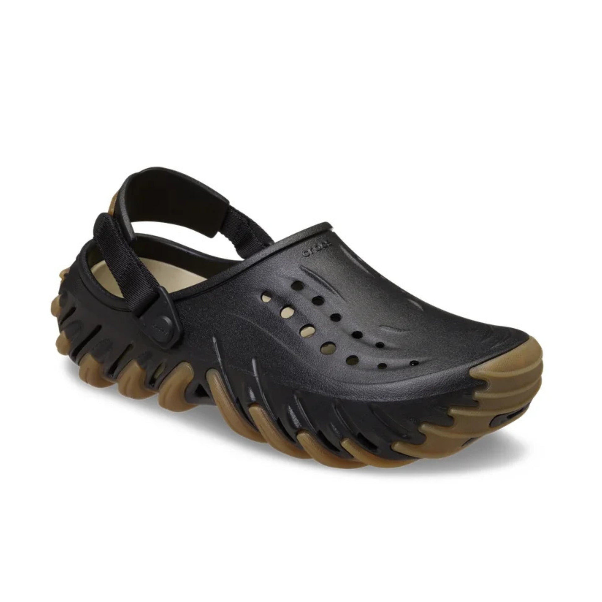 Crocs Echo Clog – Đen đế nâu (Echo Gum RO Clog BLK) là mẫu dép thời trang mang phong cách thể thao với thiết kế hầm hố, cá tính. Được làm từ chất liệu Croslite™ nhẹ và êm ái, kết hợp đế ngoài màu nâu gum nổi bật, giúp tăng độ bám và tạo điểm nhấn độc đáo. Quai gót có thể điều chỉnh linh hoạt – phù hợp cho cả đi chơi, đi phố và phối đồ streetwear.